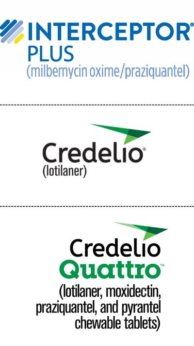 We are excited to offer Credelio Quattro, a convenient, new monthly, beef-flavored chewable that combines Interceptor Plus and Credelio. This all-in-one product provides the broadest parasite protection of its kind in a single dose, protecting against six types of parasites: fleas, ticks, heartworms, roundworms, hookworms, and tapeworms.